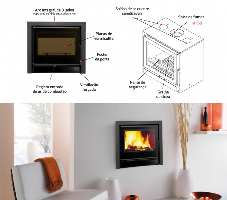 Recuperador de calor de lenha a ar, com porta em vidro serigrafado.